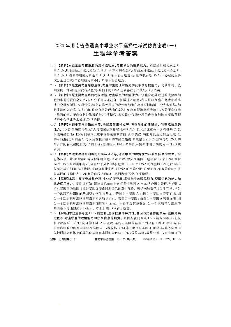 高三生物答案--湖南省普通高中2023年学业水平选择性考试仿真密卷(一)(新教材新高考)