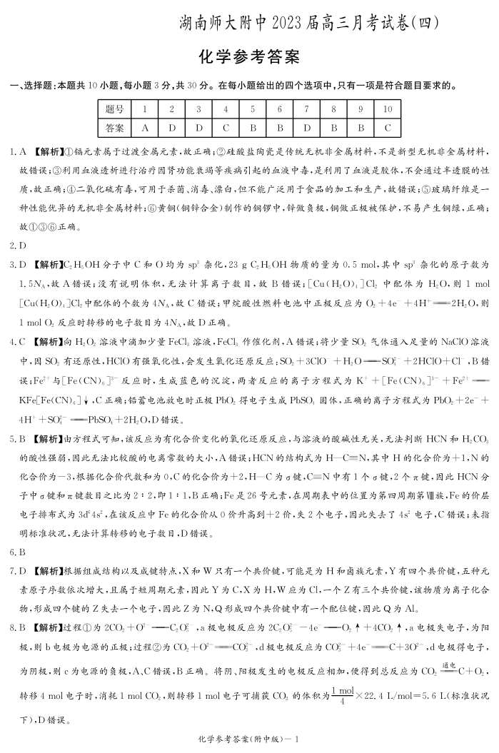 高三化学答案-湖南师范大学附属中学2022-2023学年高三上学期月考卷(四)