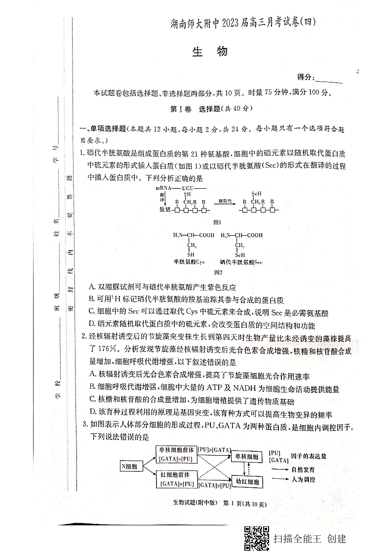 高三生物-湖南师范大学附属中学2022-2023学年高三上学期月考卷(四)