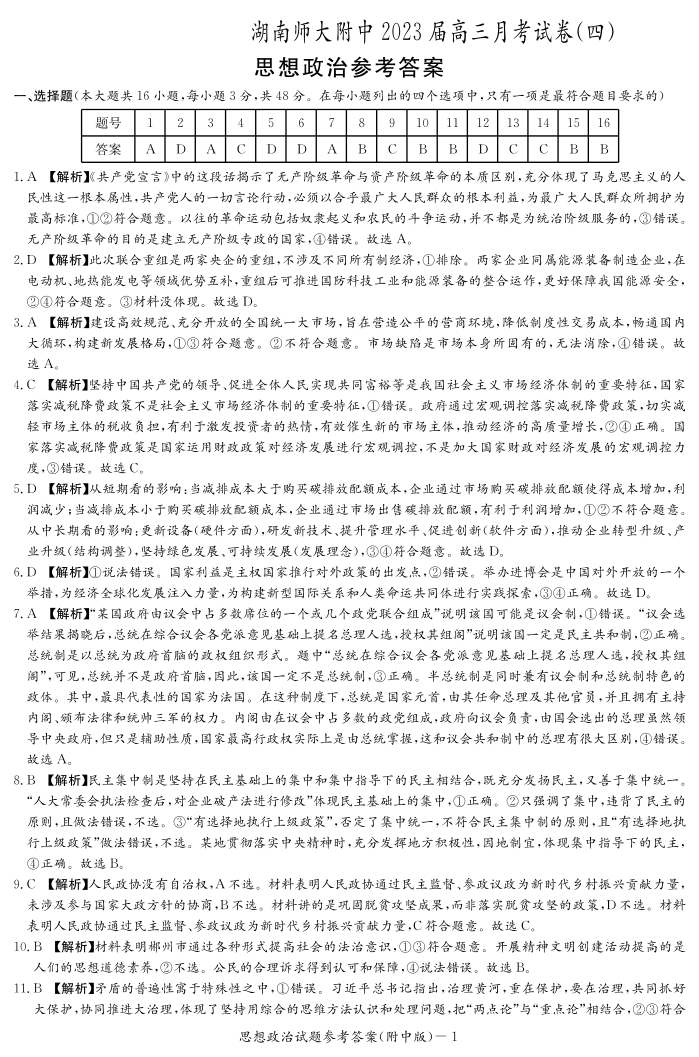 高三政治答案-湖南师范大学附属中学2022-2023学年高三上学期月考卷(四)