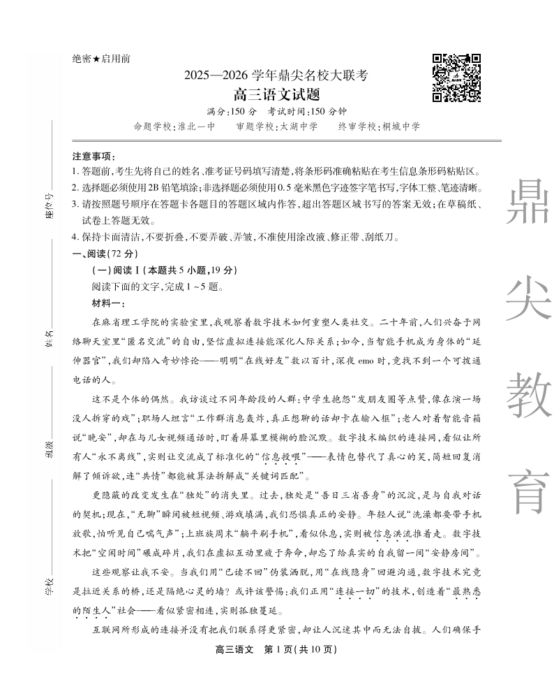 高三语文--安徽省鼎尖名校大联考2026届高三上学期10月月考