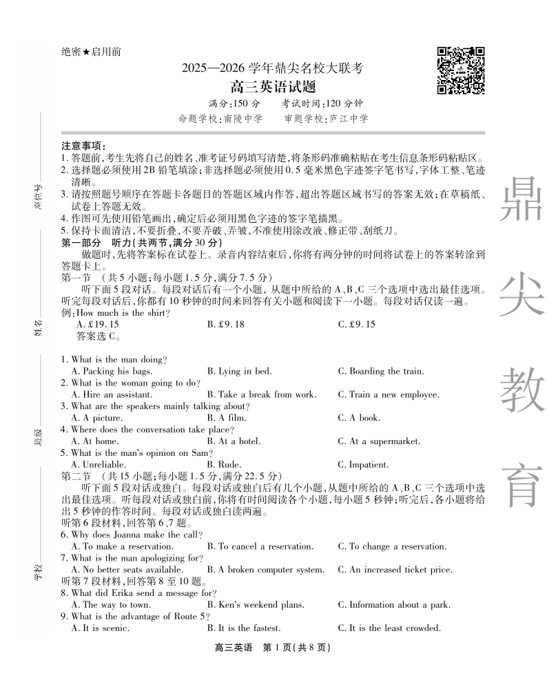 高三英语--安徽省鼎尖名校大联考2026届高三上学期10月月考