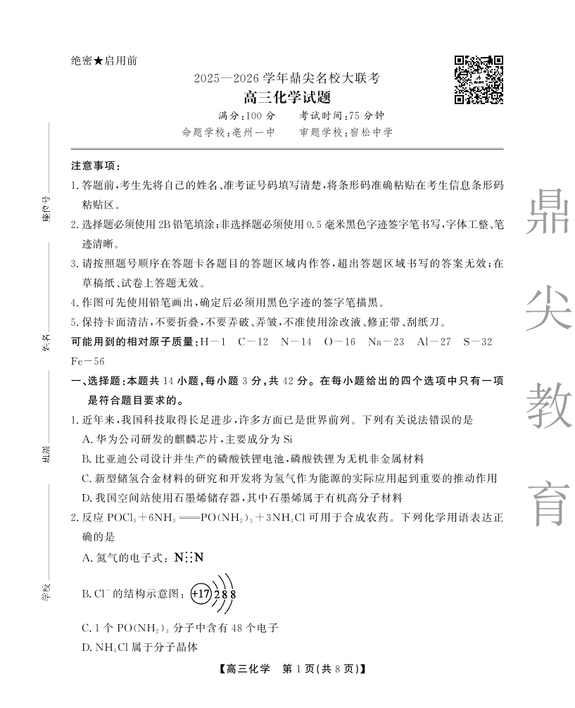 高三化学--安徽省鼎尖名校大联考2026届高三上学期10月月考