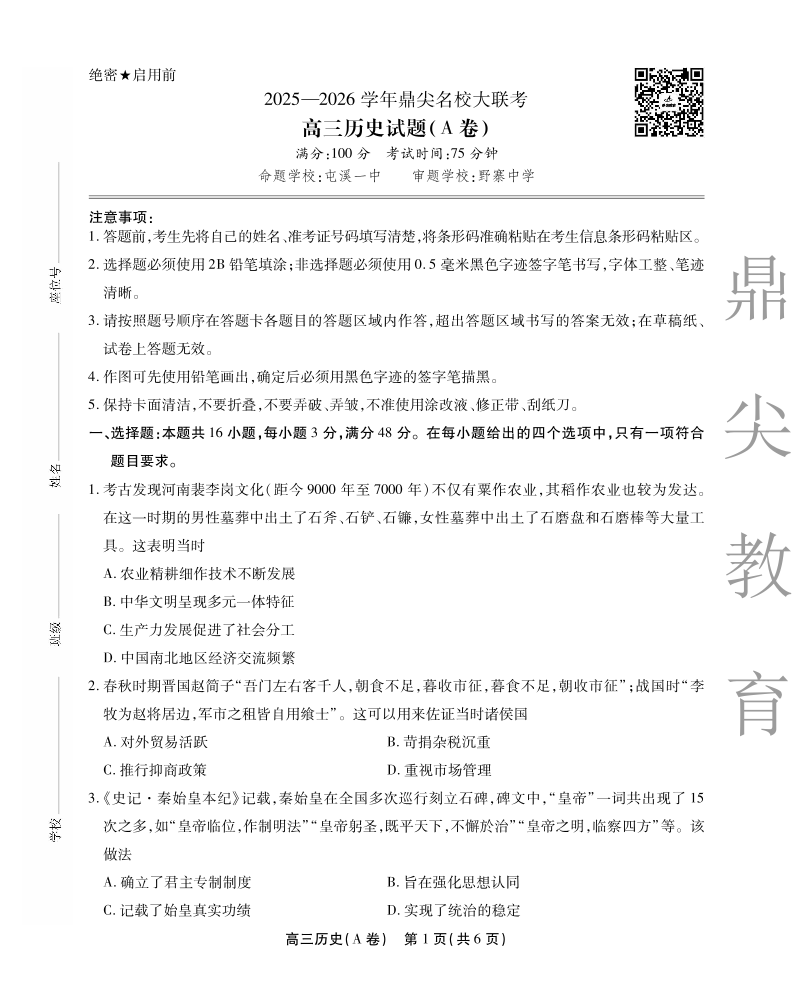 高三历史--安徽省鼎尖名校大联考2026届高三上学期10月月考