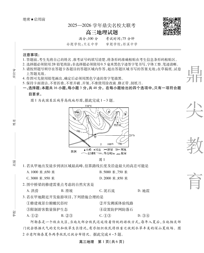 高三地理--安徽省鼎尖名校大联考2026届高三上学期10月月考