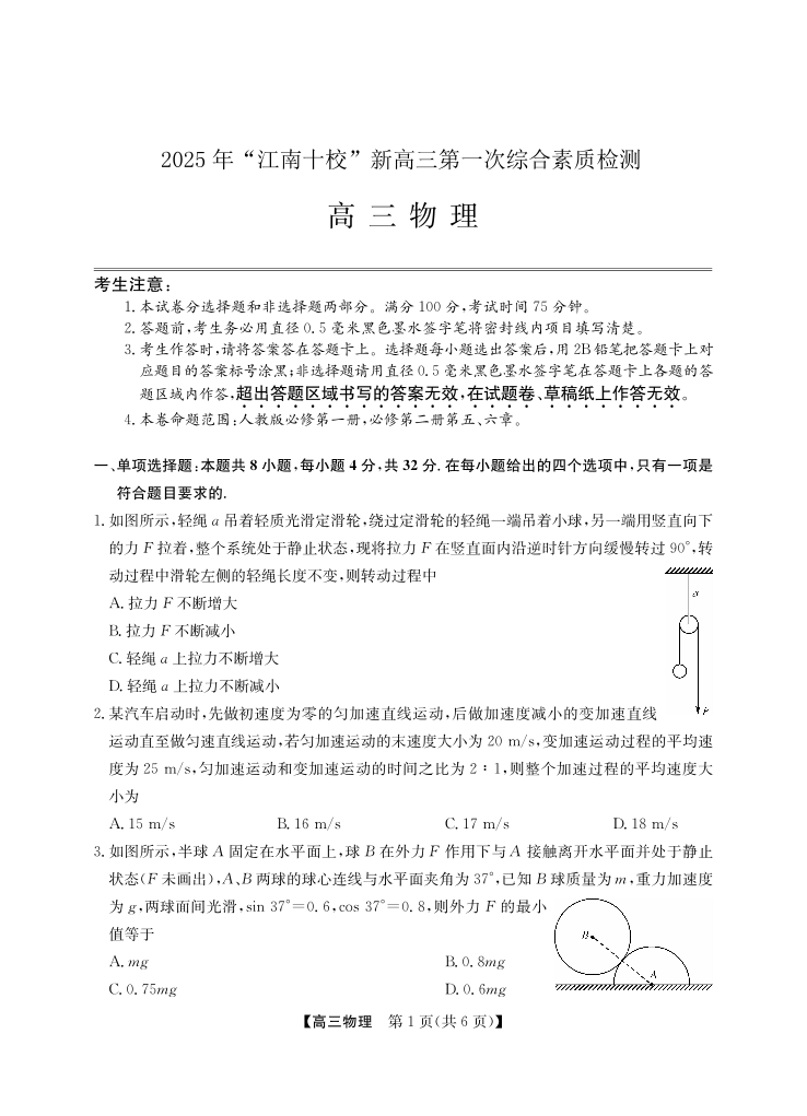 高三物理--安徽省江南十校2026届高三第一次综合素质检测