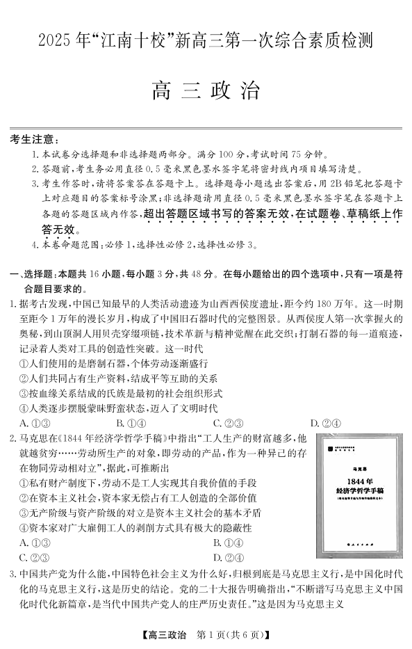 高三政治B--安徽省江南十校2026届高三第一次综合素质检测