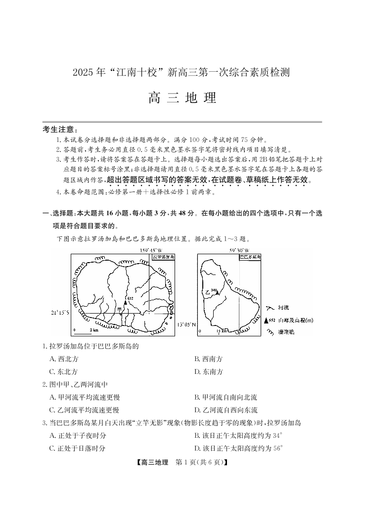高三地理A--安徽省江南十校2026届高三第一次综合素质检测