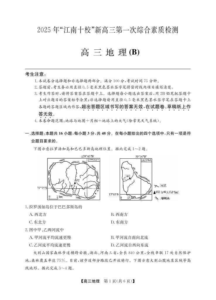高三地理B--安徽省江南十校2026届高三第一次综合素质检测