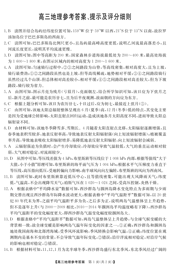 高三地理B答案--安徽省江南十校2026届高三第一次综合素质检测