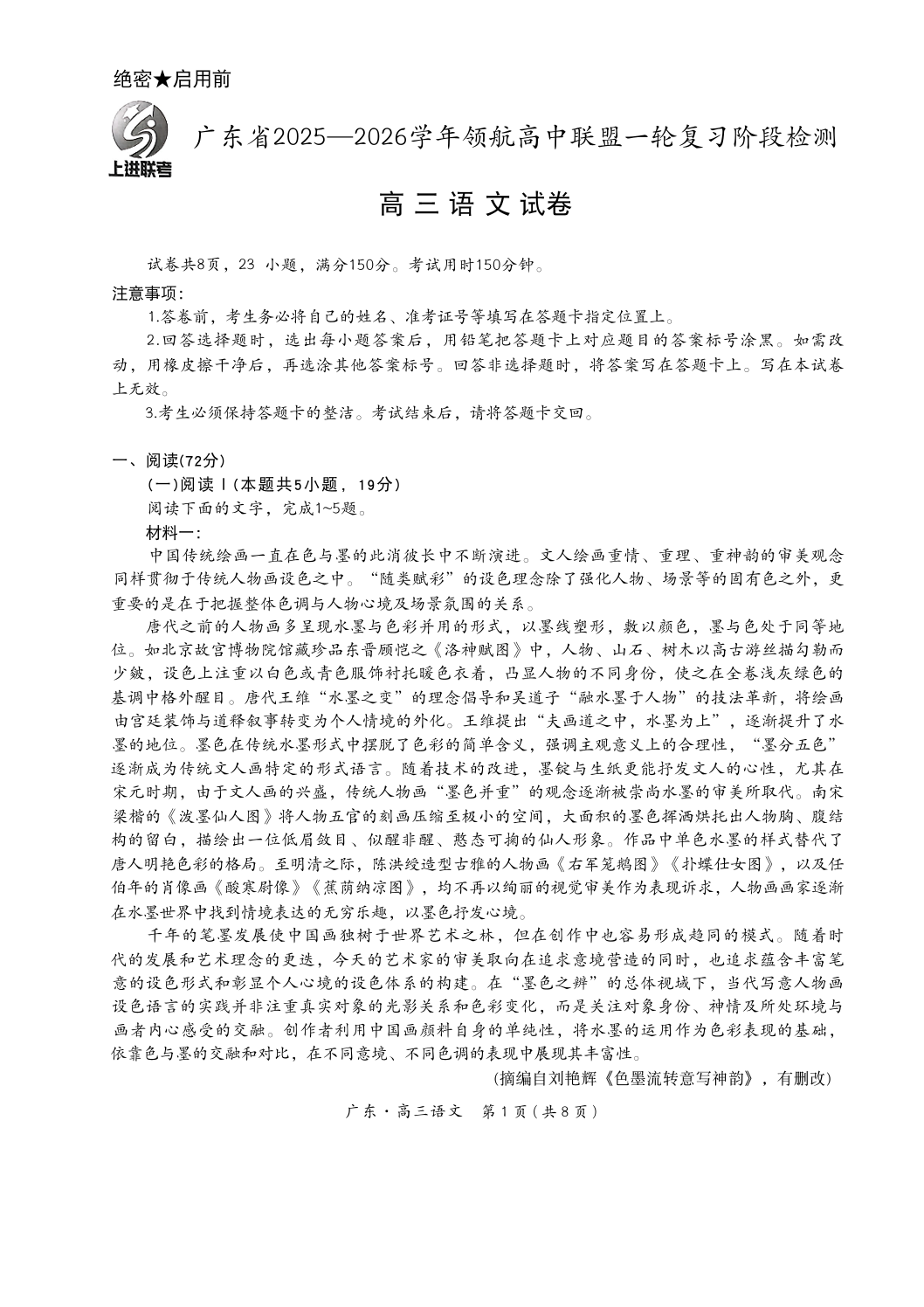 高三语文--广东省上进联考领航高中联盟2026届高三10月一轮复习阶段检测