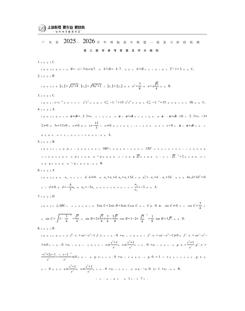 高三数学答案--广东省上进联考领航高中联盟2026届高三10月一轮复习阶段检测