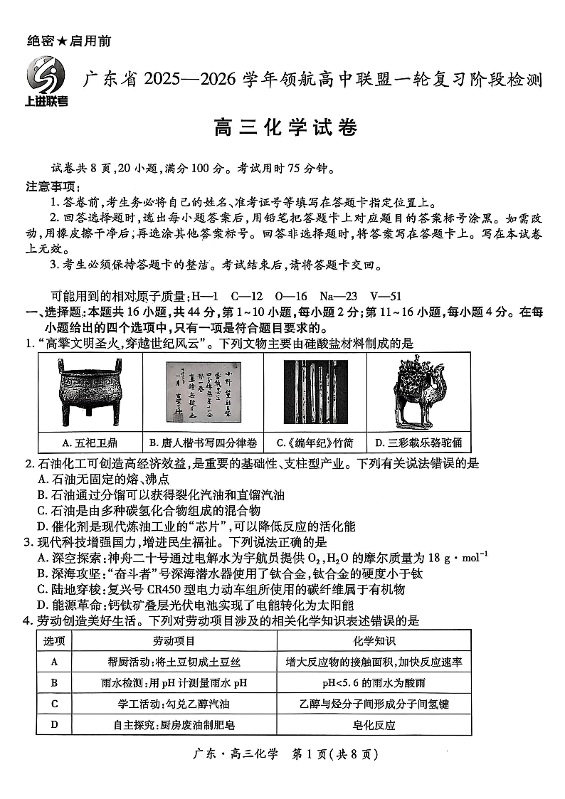 高三化学--广东省上进联考领航高中联盟2026届高三10月一轮复习阶段检测