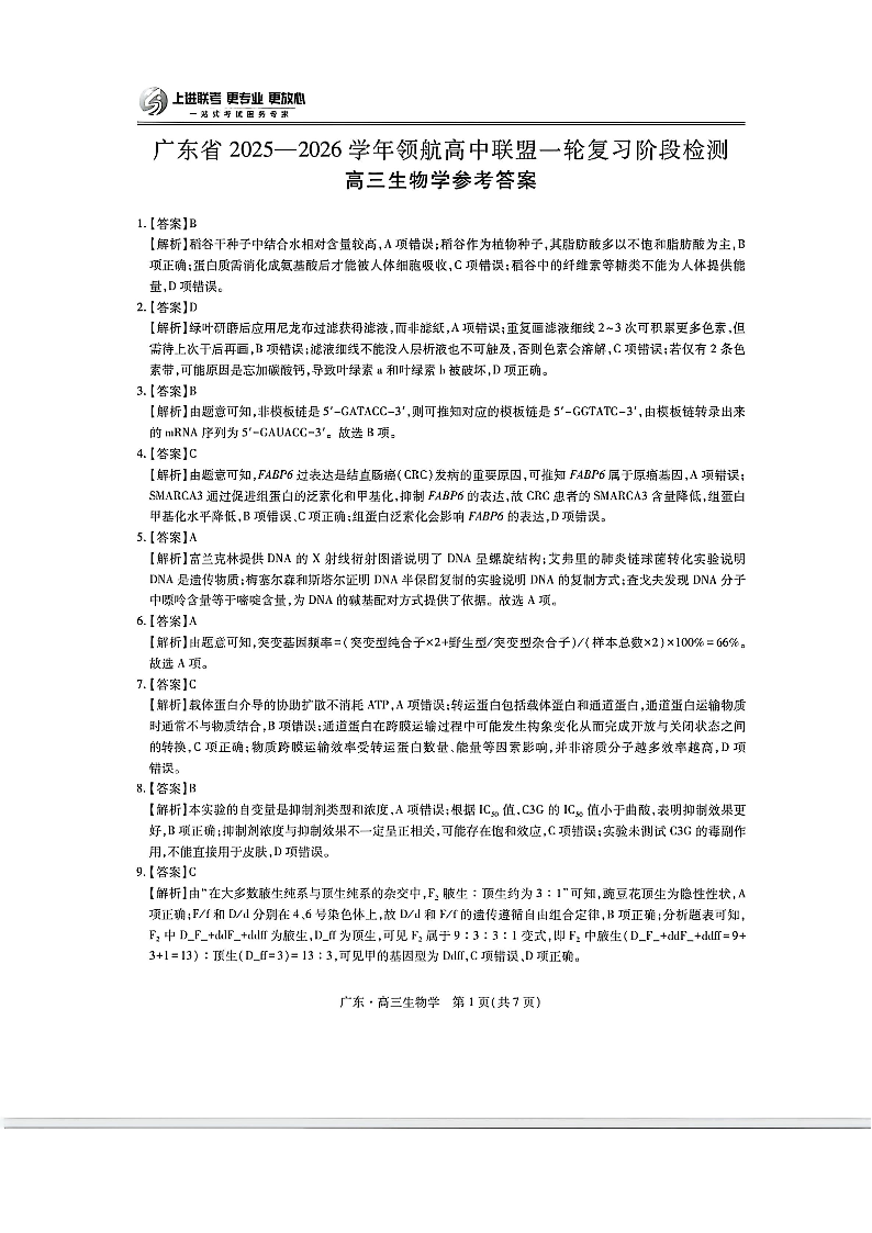 高三生物答案--广东省上进联考领航高中联盟2026届高三10月一轮复习阶段检测