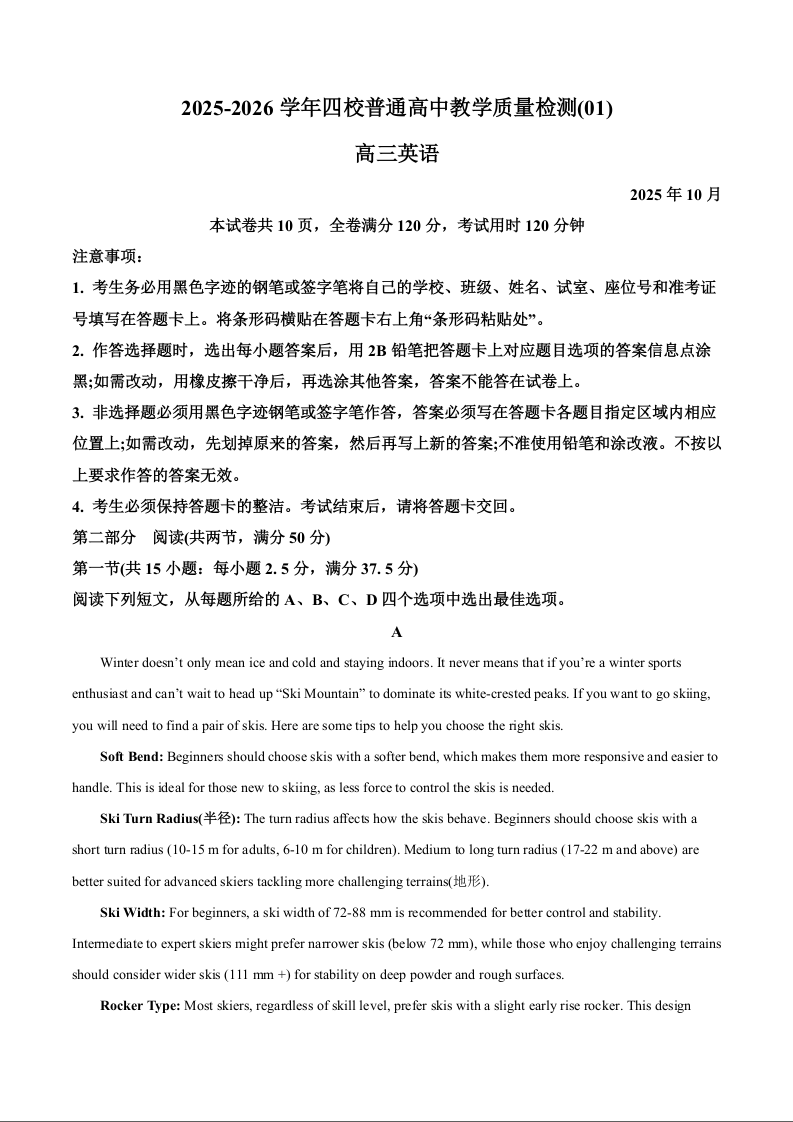 高三英语+答案--广东省四校2026届高三上学期10月教学质量检测