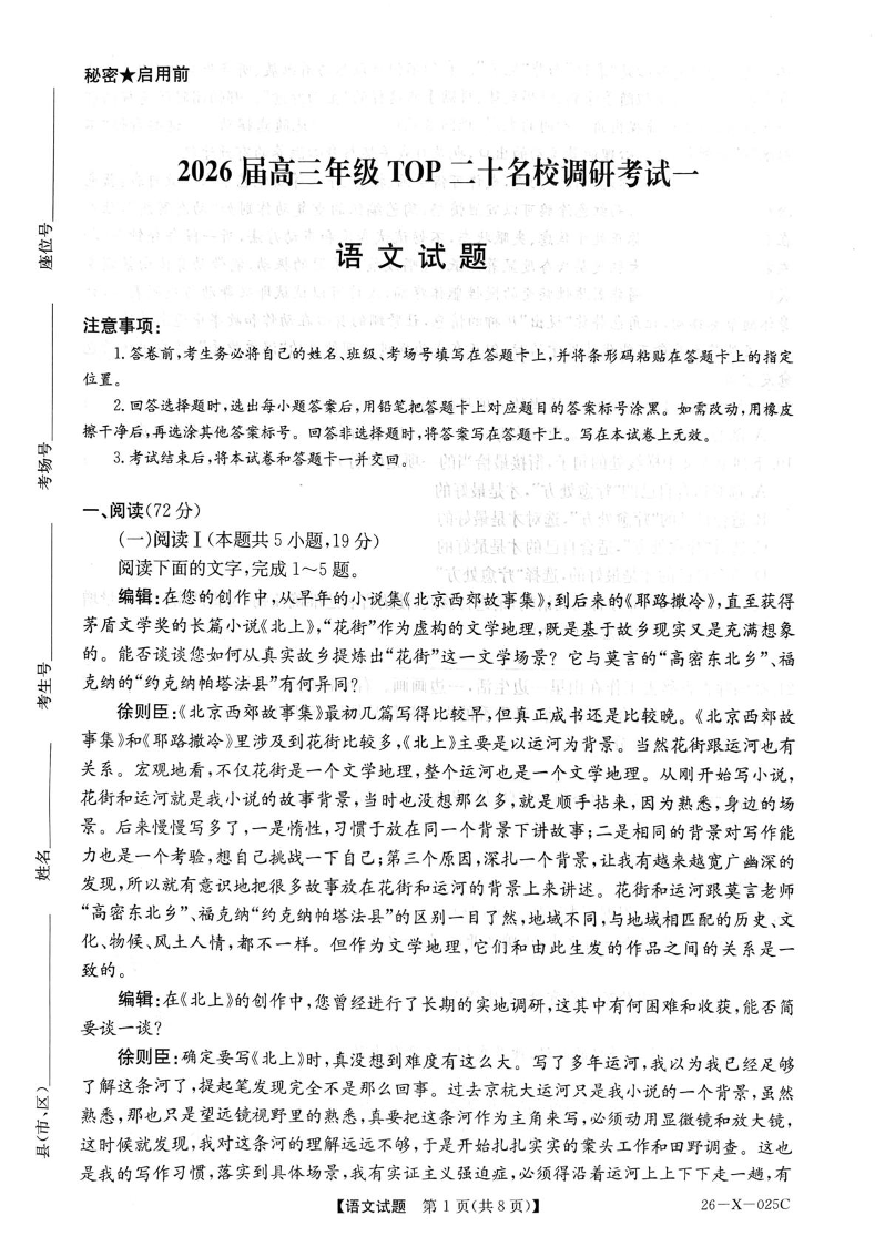 高三语文--河南省TOP二十名校2026届高三上学期调研考试(一)