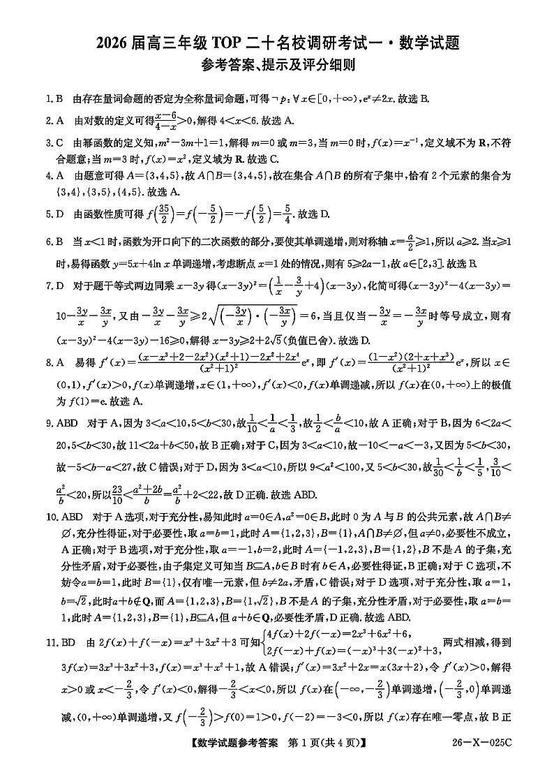 高三数学答案--河南省TOP二十名校2026届高三上学期调研考试(一)
