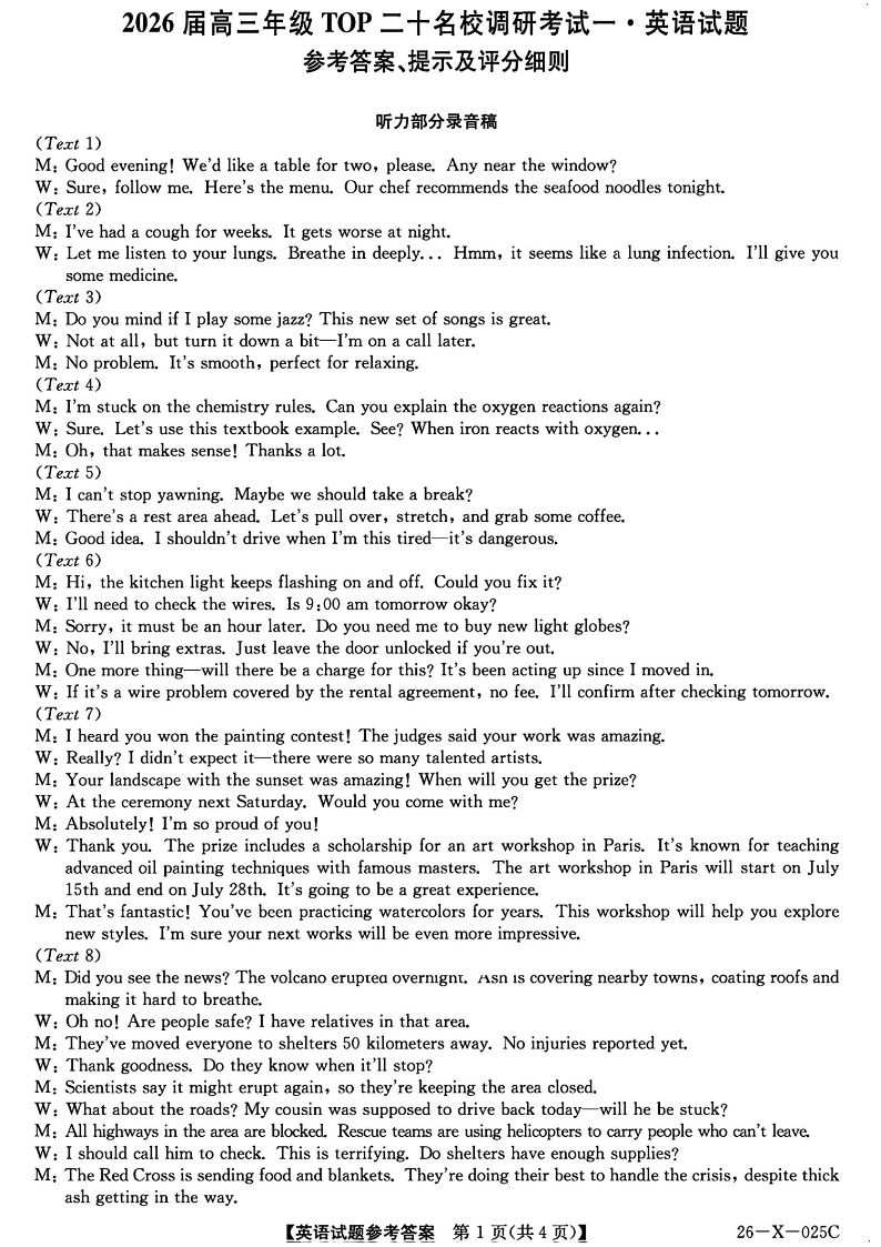 高三英语答案--河南省TOP二十名校2026届高三上学期调研考试(一)