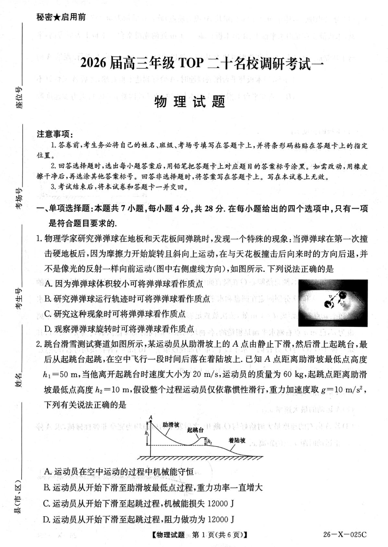高三物理--河南省TOP二十名校2026届高三上学期调研考试(一)