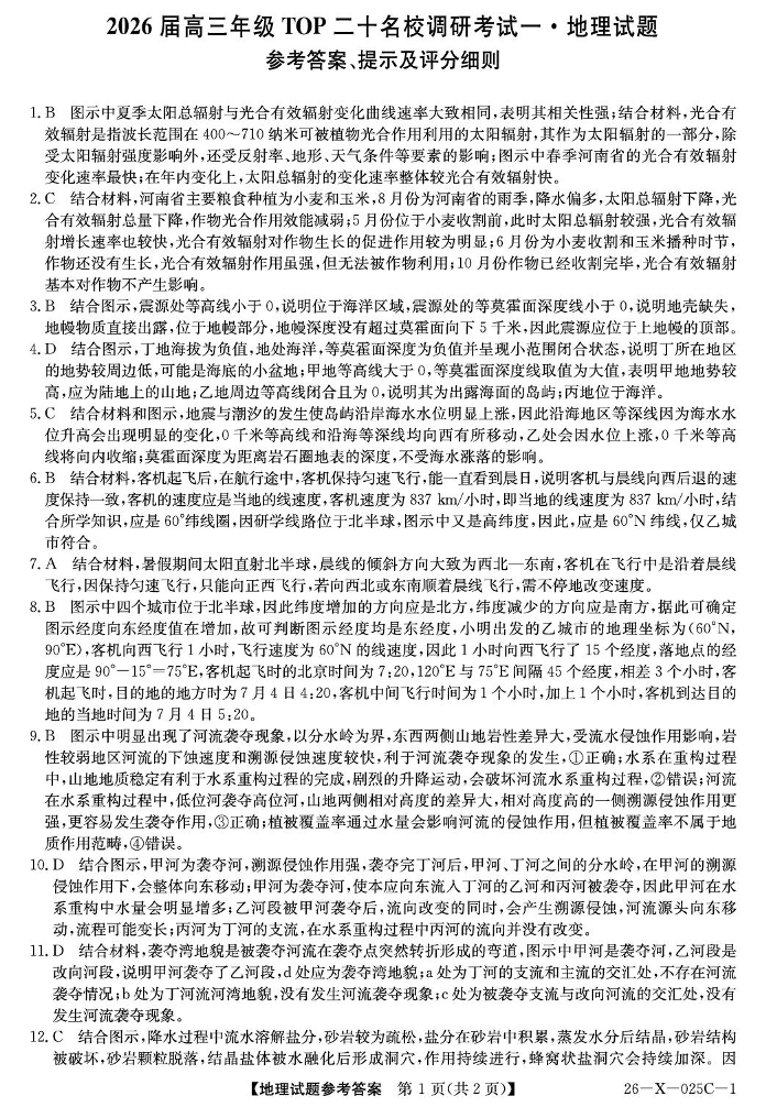 高三地理答案--河南省TOP二十名校2026届高三上学期调研考试(一)