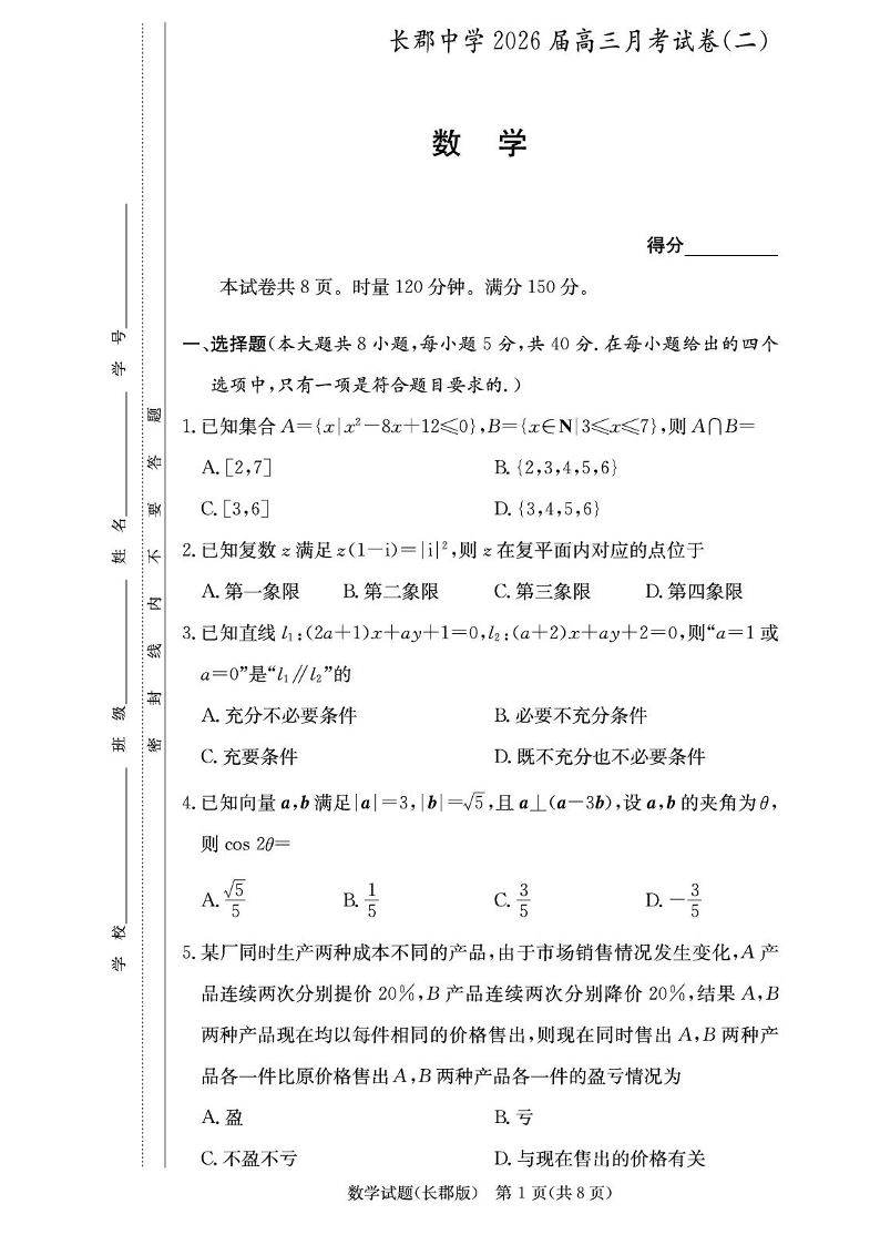 高三数学+答案--湖南省长沙市长郡中学2026届高三上学期月考(二)