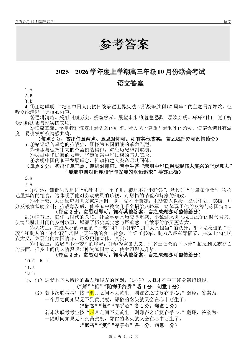 高三语文答案--辽宁省普通高中点石联考2026届高三上学期10月月考