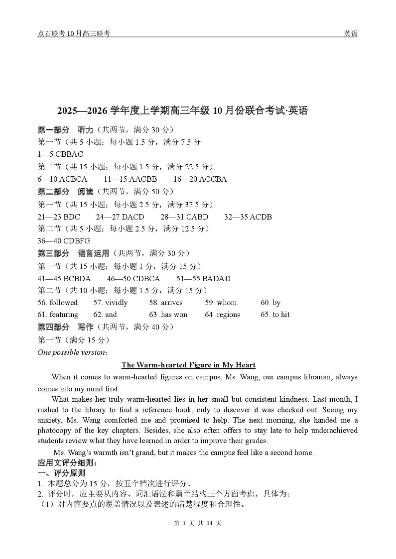 高三英语答案--辽宁省普通高中点石联考2026届高三上学期10月月考