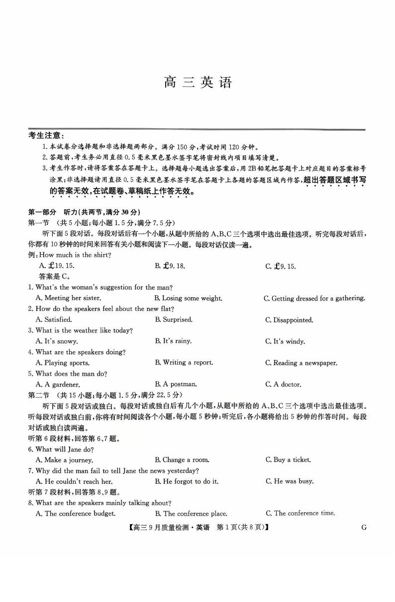 高三英语--九师联盟2026届高三9月质量检测巩固卷(G)(10月联考)