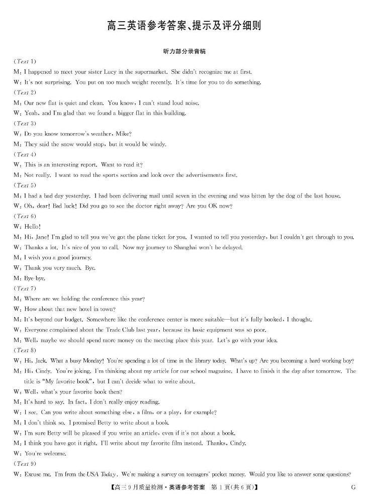 高三英语答案--九师联盟2026届高三9月质量检测巩固卷(G)(10月联考)