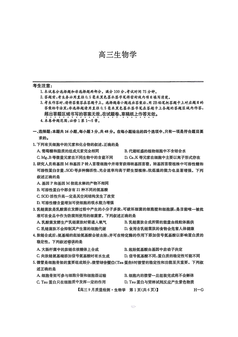 高三生物+答案--九师联盟2026届高三9月质量检测巩固卷(G)(10月联考)