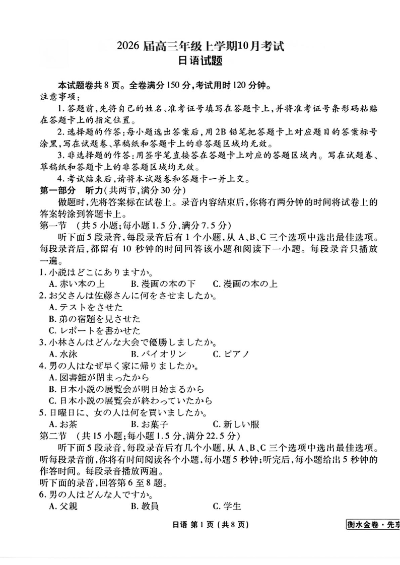 高三日语+答案--河北省承德市五校2026届高三上学期10月月考