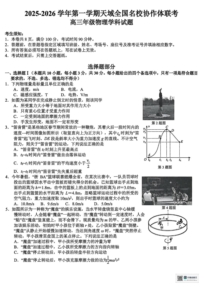 高三物理+答案--浙江省天域全国名校协作体2026届高三上学期10月联考