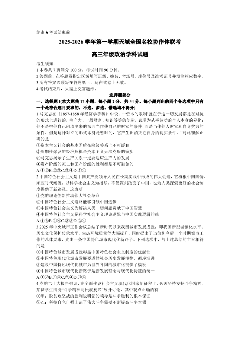 高三政治+答案--浙江省天域全国名校协作体2026届高三上学期10月联考