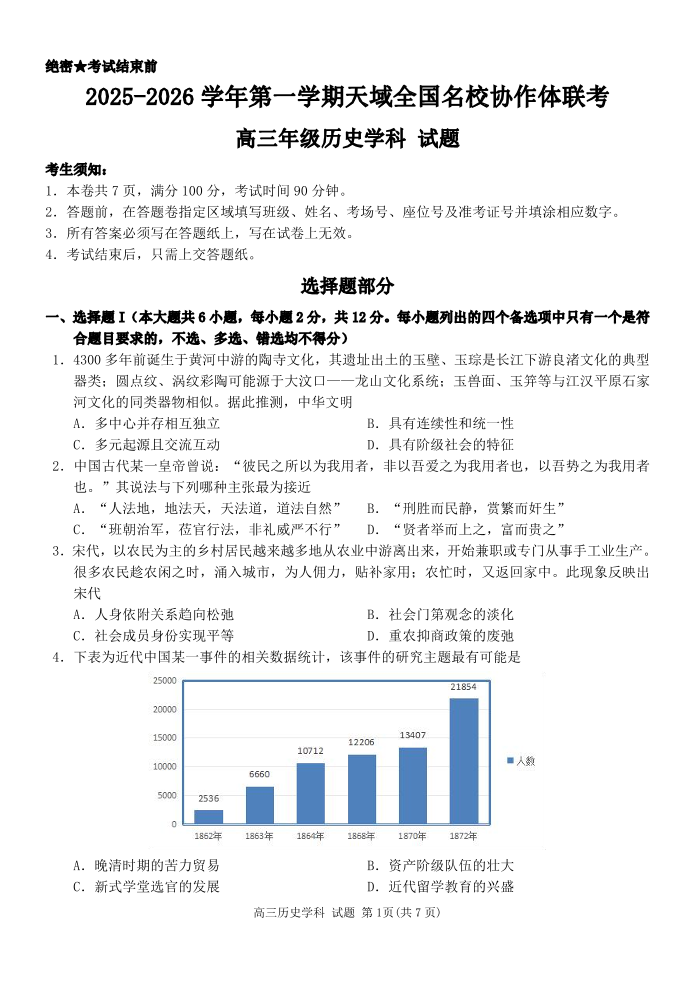 高三历史+答案--浙江省天域全国名校协作体2026届高三上学期10月联考