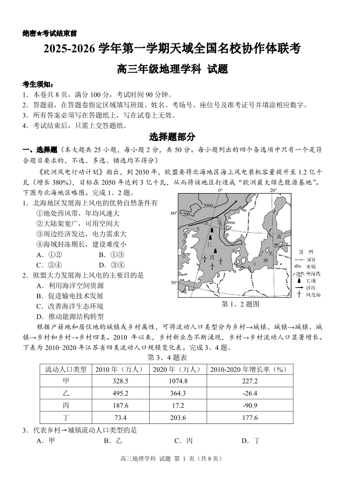高三地理+答案--浙江省天域全国名校协作体2026届高三上学期10月联考
