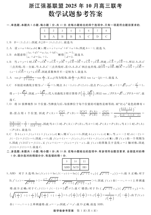高三数学答案--浙江省强基联盟2026j届高三上学期10月联考