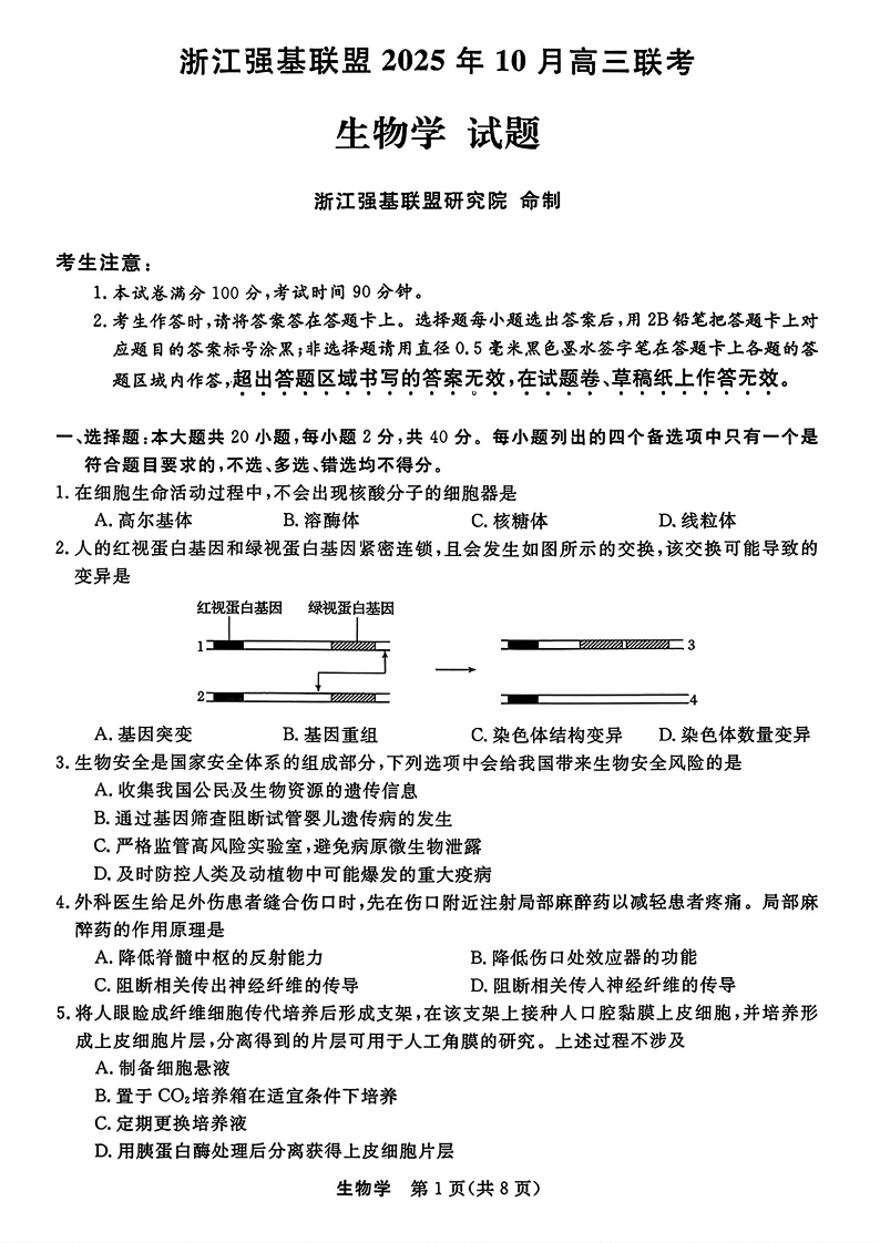 高三生物--浙江省强基联盟2026j届高三上学期10月联考