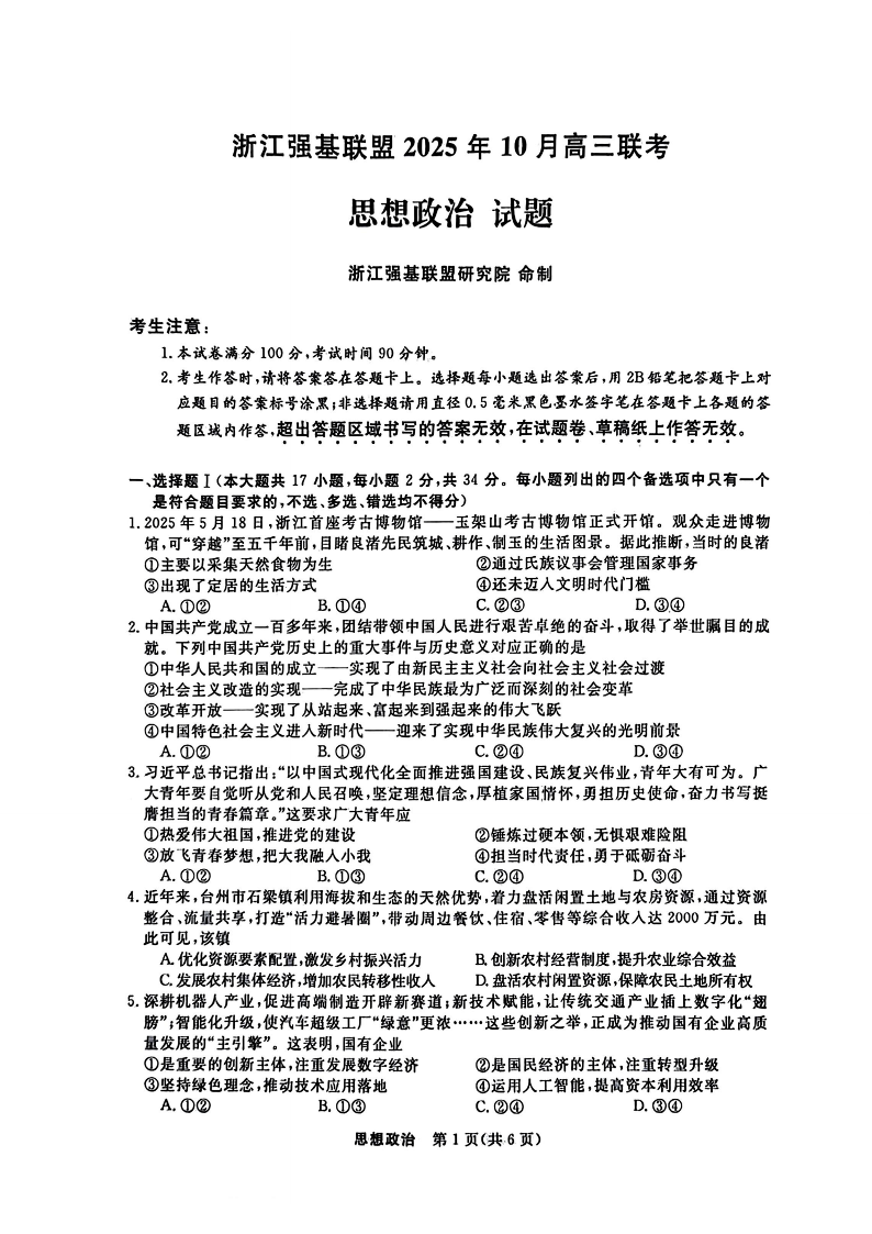 高三政治--浙江省强基联盟2026j届高三上学期10月联考