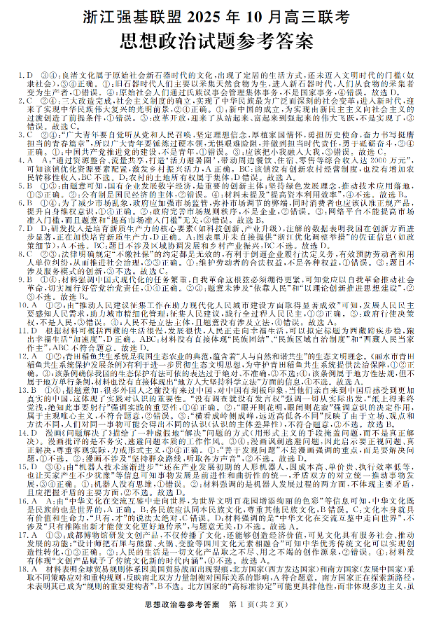 高三政治答案--浙江省强基联盟2026j届高三上学期10月联考