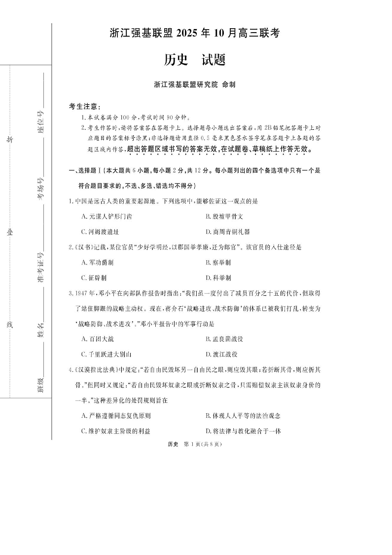 高三历史--浙江省强基联盟2026j届高三上学期10月联考