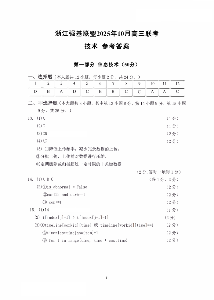 高三技术答案--浙江省强基联盟2026j届高三上学期10月联考