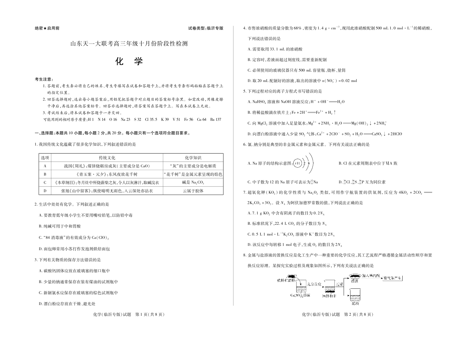 高三化学(临沂专版)--山东省天一大联考2026届高三年级十月份阶段性检测