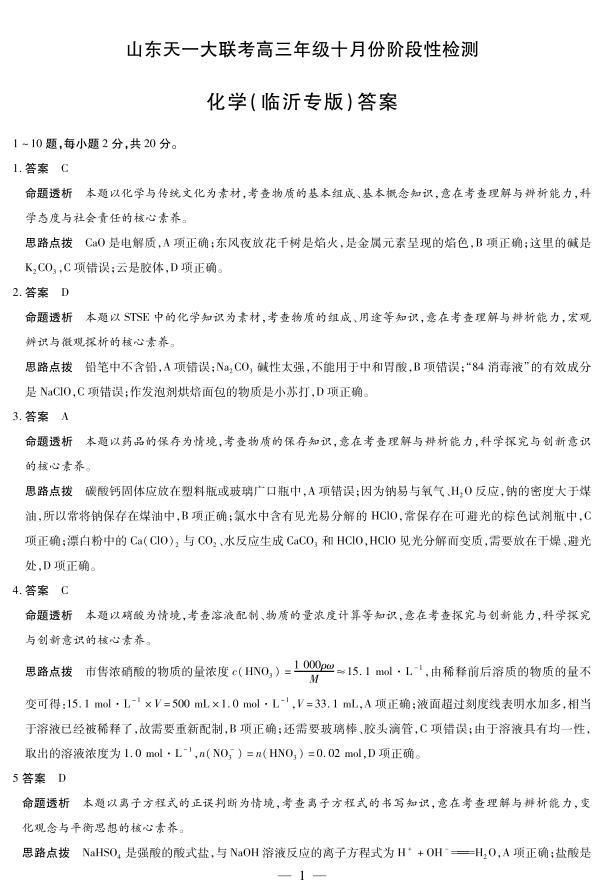 高三化学答案(临沂专版)--山东省天一大联考2026届高三年级十月份阶段性检测