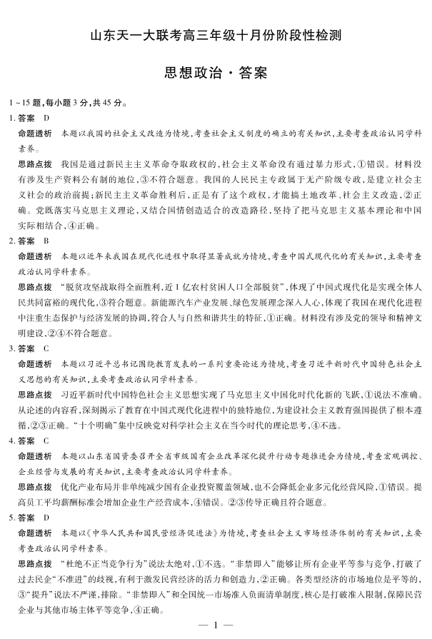 高三政治答案--山东省天一大联考2026届高三年级十月份阶段性检测