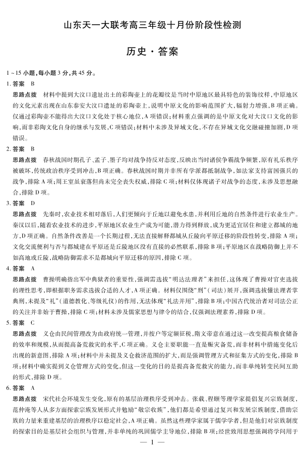 高三历史答案--山东省天一大联考2026届高三年级十月份阶段性检测