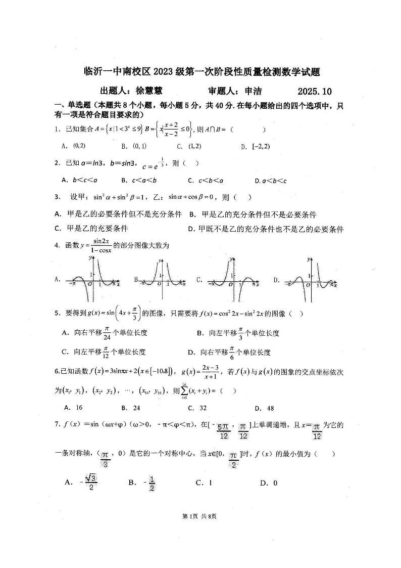 高三数学+答案--山东省临沂第一中学2026届高三上学期10月第一次阶段性质量检测