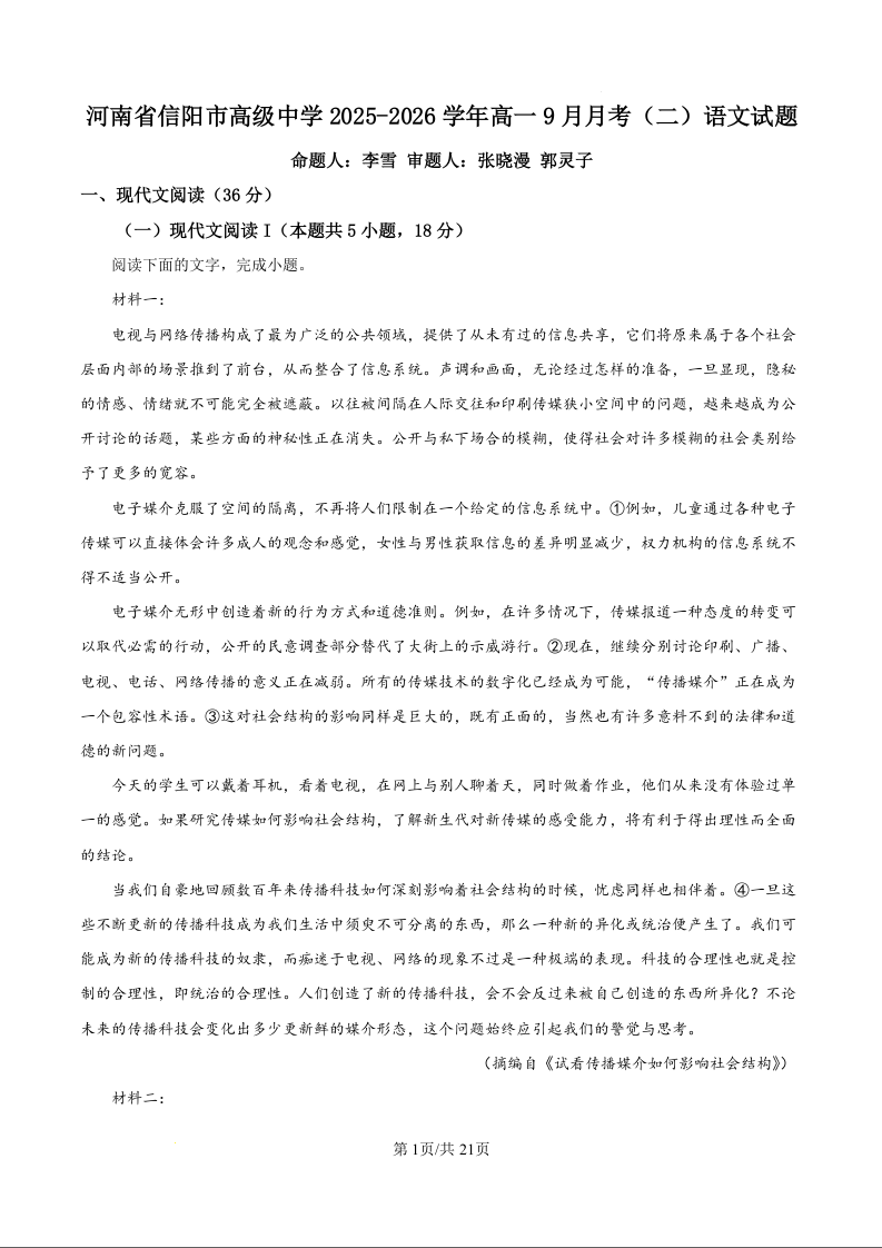 高一语文(精品解析版)--河南省信阳市信阳高级中学2025-2026学年高一上学期9月测试(二)试题 (1)
