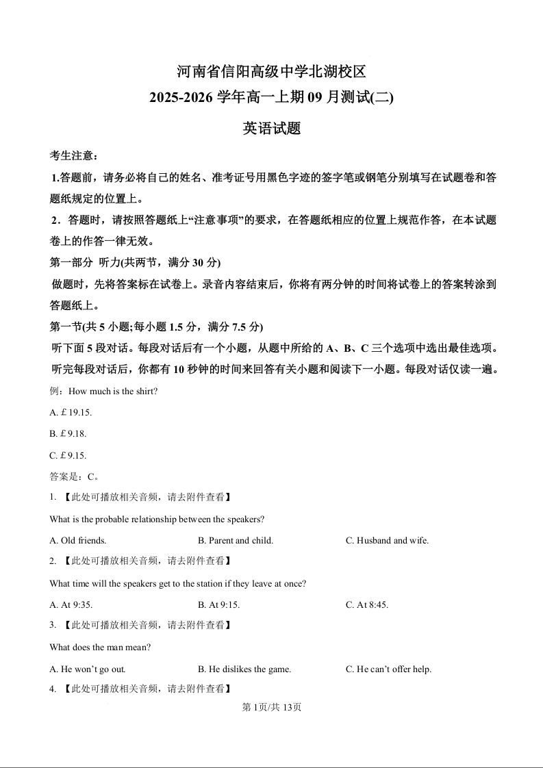 高一英语(原卷版)--河南省信阳市信阳高级中学2025-2026学年高一上学期9月测试(二)试题