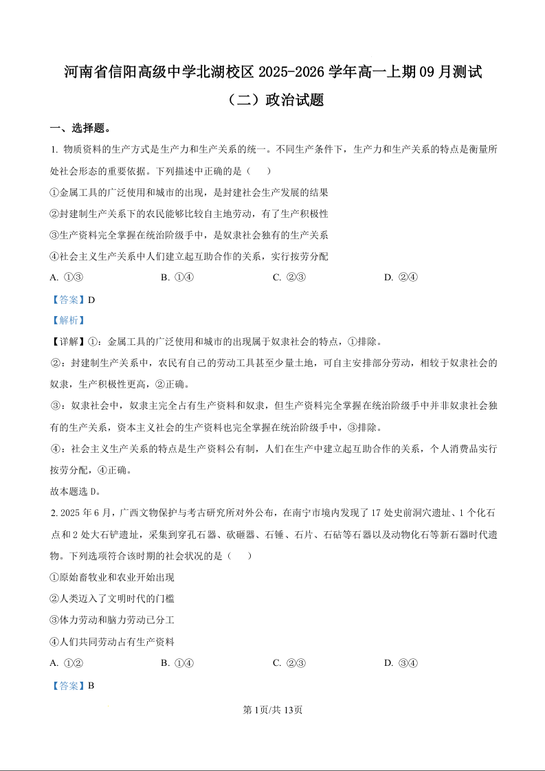 高一政治(精品解析版)--河南省信阳市信阳高级中学2025-2026学年高一上学期9月测试(二)试题