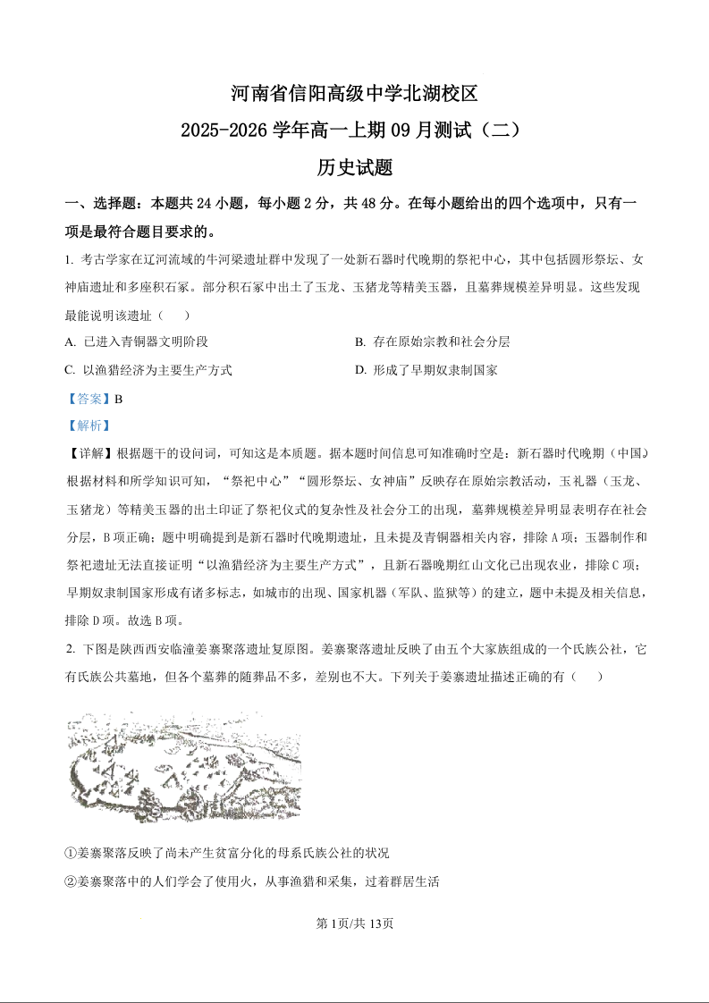 高一历史(精品解析版)---河南省信阳市信阳高级中学2025-2026学年高一上学期9月测试(二)试题